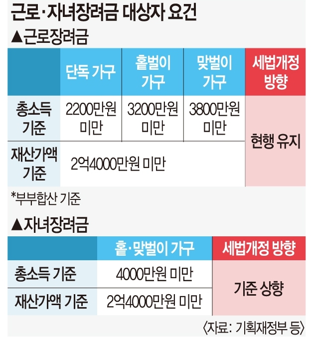 18일 복수의 정부 관계자에 따르면 정부는 근로장려금 현행 유지, 자녀장려금 대상 확대 등으로 세법개정 방향을 잡았다.