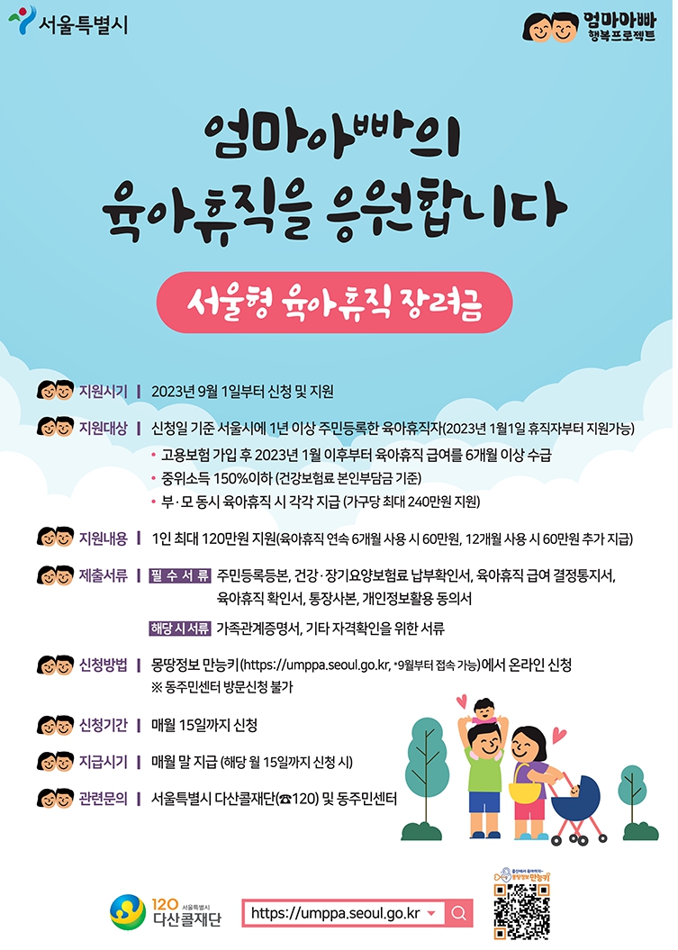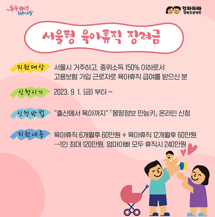 서울시가 육아휴직한 엄마아빠를 위해 서울형 육아휴직 장려금신청 및 접수를 9월 1일부터 시작한다.