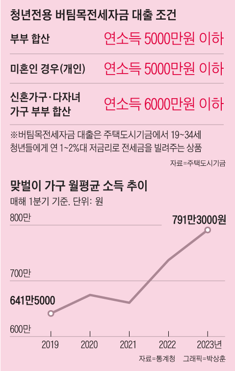 버팀목전세자금 貸出처럼 맞벌이 가구 소득 합산과 미혼의 소득 조건이 크게 차이 나지 않는 경우가 많기 때문이다.